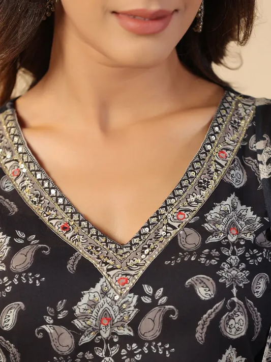 Black Charm: Adda Work Cotton Kurta Set with Block Print Dupatta