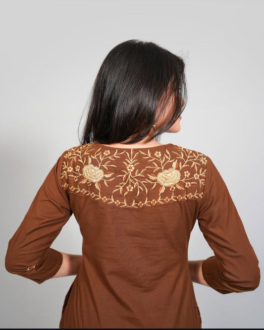 Brown Elegance: Embroidered Cotton Kurta Set