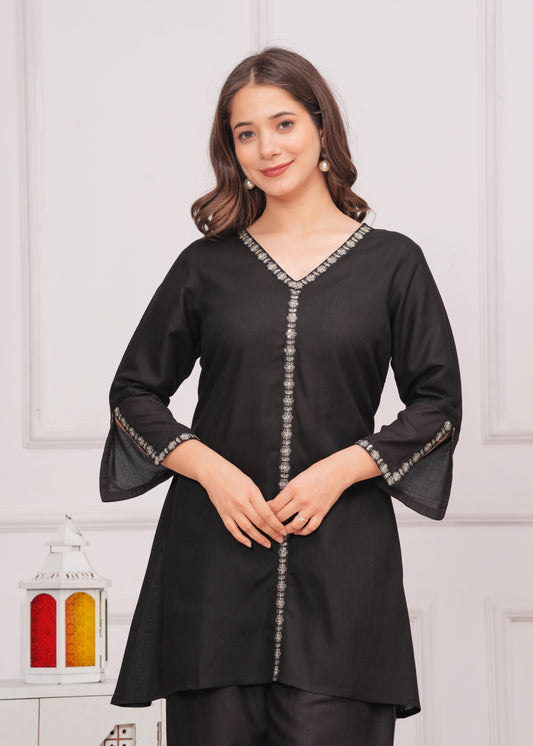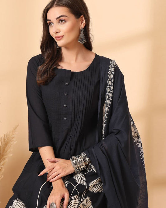 Black Grace: Cotton Kurta Set with Mulmul Dupatta