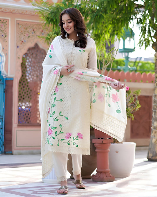 White Charm: Hand-Printed Cotton Kurta Set with Dupatta